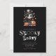 This invitation captures the essence of Halloween with an endearing twist. Against the dramatic black backdrop and alternating lines of stark white and light purple text, the words "spooky party" are presented in a horror movie cut-from-magazines letter font, adding an element of surprise and a touch of whimsical spookiness to the overall design.
