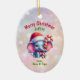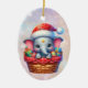 Here's an adorable Christmas ornament for a special grandson, granddaughter, son or daughter. On one side is the image of a cute elephant wearing a red and white Santa Claus hat. The little elephant pops out of a wicker gift basket among brightly wrapped presents. The image is placed on a pink and lavender bokeh background. The back of the ornament has the same bokeh background with a second image of the elephant with a candy cane, and your custom text. Easy to customize for your own child. AI generative content.