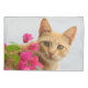 A curious red tabby kitten is watching you, peering from behind a flowering bougainvilla with prying eyes, portrait. This cozy pillow case is a gift idea for cat and pet lovers. A cute ginger kitty portrait photo taken by Katho Menden.