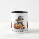 Meow! Add Whimsical Charm to your Festive Holiday Table with this Cute Cat Halloween Mug! The Artwork features a Cute Tabby Cat sporting a Witches Costume. His Jack-o-lantern has a Cute Little Kitten peeking out of the top of the Pumpkin. The verse says, "Happy Halloween Jennifer!." Personalize this Cat Mug by adding your Loved Ones Name, or Your Own Phrase!