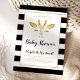 This sweet modern baby shower invitation features a cute faux gold foil giraffe face with long eyelashes. The words "Baby Shower" and the name of the mother-to-be appear in black calligraphy. Behind the faux gold rectangular frame is a background of black and white stripes. The ideal for a black and gold giraffe, safari, or zoo themed baby shower.