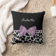 A cute black and white giraffe print throw pillow with a girly lavender purple ribbon tied into a feminine bow. Personalize this pretty animal print design by adding your name. Reverse side has a black and white giraffe pattern. Flat printed image, not actual bow.