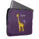 Personalized purple giraffe laptop sleeve for a girl with a cute giraffe nibbling on a violet flower and holding some flowers with its tail while skating with roller skates which wheels are made of flowers, on dark purple background. This cute personalized laptop sleeve will make a great gift for someone who loves giraffes, cartoon animals and cute illustrations.