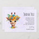 Thank you card with a whimsical watercolor illustration featuring a giraffe face wearing a pretty spring floral crown. Colourful and cute.