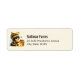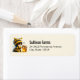 Address labels with a cute image. A girl in a crocheted bee costume with a bee by her side. Watching over a jar of honey.