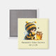 Baby Shower save the date / keepsake magnet with a cute image. A girl in a crocheted bee costume with a bee by her side. Watching over a jar of honey.