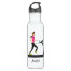 This water bottle features Destei's illustration of a cute brunette girl who is running on a treadmill. The girl has brown long hair that is on a ponytail, she is wearing a pink shirt, black leggings and green shoes. The treadmill is black and there is a blue water bottle on it. There is also a personalizable text area for a name.