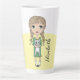 Cute girl holding a cat. Sweet girl with big green eyes, brown hair, green dress, and an adorable grey cat. Digital art Illustration hand-drawn by Donna Leger. Woman with Beautiful Big eyes whimsical art drawing series. Ready to be personalized, just add your name. Yellow Circle design on the background can be customized.