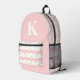 A fun pattern for girls with horizontal pink and white stripes with golden dots scattered about make this a cute choice in backpacks. A text template in the upper centre of the backpack can be personalized with your monogram initial. So stylish and girly, this versatile backpack is ready for back to school or your next adventure!