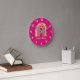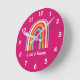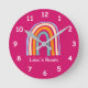 Cute girl's room wall clock with rainbow drawing. Personalize with custom name or quote. Custom background colour i.e. pink. Trendy room decor ideas for children's room or baby nursery. Girly design.