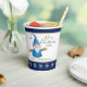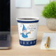Create personalized navy blue and white Christmas paper cups for your family party with a unique design that features a Merry Christmas saying, cute gnome and text templates for the year and Family name.