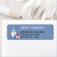 Christmas Gnome return address stickers have a cute gnome dressed in blue, carrying a candy cane, with a gift beside him. Your name is in a fancy, curly font while the address is in a simple font. Above that it says Merry Christmas in the curly font in white. Background is blue with snowflakes fluttering about. There's coordinating Christmas cards in our shop too!