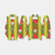 A very cute green and red Christmas gift box featuring a pattern of adorable Christmas gnomes (or elves, or Santa's helpers) with red pointy hats and long bushy beards, on a colourful chartreuse green background. They're surrounded by Christmas signs wishing all a very Merry Christmas, candy canes and striped Christmas stockings.