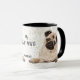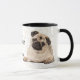 This cute mug features a little pug dog looking adorable on each side. Between the images is black text that says "My PUG MUG", with your name or monogram at the bottom. Everything is placed on a white background sprinkled with gold confetti bits. The text is in a customizable field, so that you may change it if you'd like.