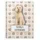 Notebook with charming Golden Retriever. This adorable design showcases cute sitting Golden Retriever puppy. Against a backdrop of dog footprints. Bone like text and customizable name.