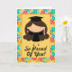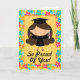 This adorable graduation card is perfect for high school graduates, college grads, kindergarten graduation and more. Cute girl graduate holding a diploma with brightly coloured flowered background has So Proud Of You sentiment.