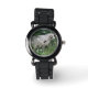 This beautiful Watch features a photograph of a cute fluffy sheep. The sheep is surrounded by wild flowers and long grass and is greedily eating some leaves. It has a thick white coat of wool and a cute black nose.