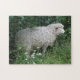 This awesome puzzle features a photograph of a cute fluffy sheep. The sheep is surrounded by wild flowers and long grass and is greedily eating some leaves. It has a thick white coat of wool and a cute black nose.
