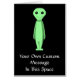 An image of a happy alien character, this alien is in green with large black eyes.
