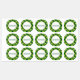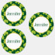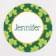 Labels with a cute repeating pattern of olive green clovers on a dark green background. Layered over top is a circle with a faux gold-foil border with a name inside.