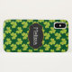 Personalized phone case with a cute repeating pattern with olive green clovers on a dark green background. A fancy vintage frame layered over top with your text inside. Frame has a faux gold foil border.