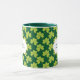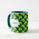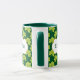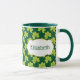 A mug with a cute repeating pattern with olive green clovers on a dark green background. A cute fancy frame with a faux gold foil border layered over top with your personalized text inside.