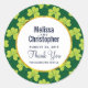 Thank you wedding sticker with a cute repeating pattern with olive green clovers on a dark green background. A circle layered over top with a faux gold-foil border with your personalized text inside.