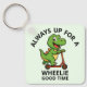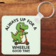 Featuring a cheerful little dinosaur riding a scooter, this keychain proudly declares, "Always up for a Wheelie good time." Whether you're gifting it to a kid, a scooter enthusiast, or a dino lover, it’s guaranteed to bring smiles.
