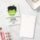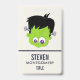 Name badge with an adorable frankenstein monster face. He has big eyes and a little smile with a scar across his forehead. Classic bolts sticking out from the sides of his head. This guy is really cute and not scary at all.
