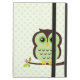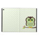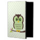 Stylish custom folio case for ipads features a sweet vector illustration of an owl perched on a tree branch on a polka dots pattern background.