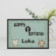 Gorgeous safari-themed greeting card featuring a cute tiger and monkey and lush botanical greenery around the edge. There is a place to personalize the age on an animal footprint and for your child's name. Inside, you can write a personal message along with the from and to info.