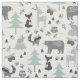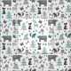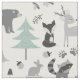 Adorable design featuring woodland animals: fox, raccoon, deer, rabbit, bears, owls and forest elements in shades of grey and teal.