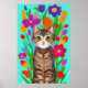 Cute folk art style cute green eyed grey cat. This art is AI generated. Pretty blue, purple and red flowers with a teal background. generativecontent