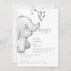 Watercolor Elephant Baby Shower Invitation. White and grey background.