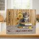 Rustic custom recipe cookbook with a cute grey kitten on a stack of books with yellow sunflowers. The background is a rustic wood and burlap design. Personalized with your name, year, or any other text you choose. Contact me for assistance with your customization or to request additional matching or coordinating Zazzle products.