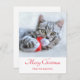 A flat holiday card with a cute Christmas photograph of a grey tabby cat playfully biting a red santa hat.