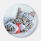 Magnet with a cute Christmas photograph of a grey tabby cat playfully biting a red santa hat.