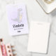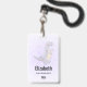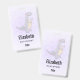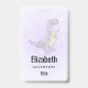 Personalized name badge with a cute illustration featuring a grayish purple dinosaur.