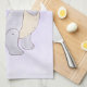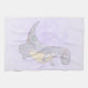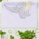 A kitchen towel with a cute illustration featuring a grayish purple dinosaur.