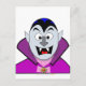 This funny cartoon vampire picture works for Halloween or a vampire-themed party. A cute cartoon vampire image, with pale skin and pointy ears, wearing a purple cape, is smiling a toothy grin.