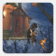 A young girl with a Halloween top hat greets a shiny orange creature from the porch of her pumpkin-shaped treehouse while her calico cat stalks at her side. Bare tree branches stand against a starry night in the background.
