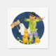 Ideal for a little boy or girl's Halloween party that is not scary. Sweet characters smile and play in a pumpkin field celebrating the holiday. A pumpkin faced scare crow with a bird on his shoulders stands over a pumpkin field with stacked pumpkins and a cute little ghost carrying a trick or treat sign. Hand painted in watercolors by Audrey Jeanne Roberts, copyright, all rights reserved.