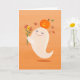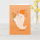 A cute little ghost smiles happily as it floats across a sherbet orange background, holding a bouquet of fall blooms as a beguiling jack-o'-lantern balances atop the ghost's head. Original illustration by Noël Snow.