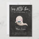 Cute halloween theme birthday party invitation template card for kids featuring an illustration of a ghost with a blue bow tie on a black chalkboard background. The text above says "out little boo is turning [your age]." Perfect for a boy's birthday in fall.