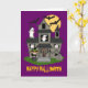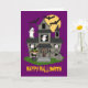 Cute Halloween haunted house and little witch greeting card, featuring a haunted house with cute ghosts, bats, black cats and a little witch on purple background.