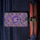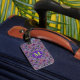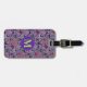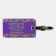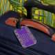 This cute Halloween luggage tag has a sweater pattern is based off of the theme of classic Fair Isle knitted designs. The pattern is of purple and green circles and diamond stripes. Each shape has a different cute Halloween motifs in it. You have black cat with a moon, Frankenstein’s head, happy jack o’ lantern pumpkin, skull with red eye raven, witches hat with feet, grave yard with ghosts, vampire lips/teeth with bats, and a picketed fence yard with a fall tree the moon with a bat. In-between the designs are candy corn, wrapped candy and a diamond design. On the front in matching colour is where you can put your initial. On the back you can personalize this with your information or delete the info for it to be blank.