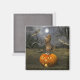 An orange tabby cat uses a cat-faced jack o' lantern to try to reach flying bats.