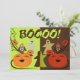 Personnalisez l'invitation à l'Halloween de Cute Boo avec six citrouilles heureux, deux chouettes et trois fantômes. Une moitié est vert clair et l'autre moitié est brun foncé.