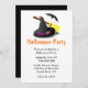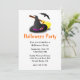 Cute custom Halloween party invitation, with simple graphics of a witch's hat, broom, and a bat, at the top of the white invitation. Personalize all the text for your Halloween bash. Suitable for adult and children parties.