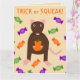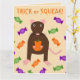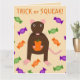 This awesome card features a graphic image of a cute little brown rat with pink ears tail and feet. The rat is holding an orange pumpkin between its paws. There is a collection of green, purple and orange candy sweets surrounding the little rat. This design is perfect for any rat lover or owner this Halloween.
